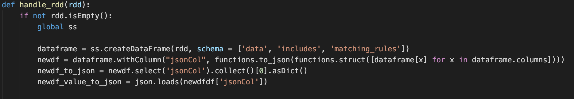 dataframe = SparkSession.createDataFrame(rdd, schema = ['col_name1', 'col_name2', ...])dataframe 내 모든 colums => 하나의 new json column으로 생성하기