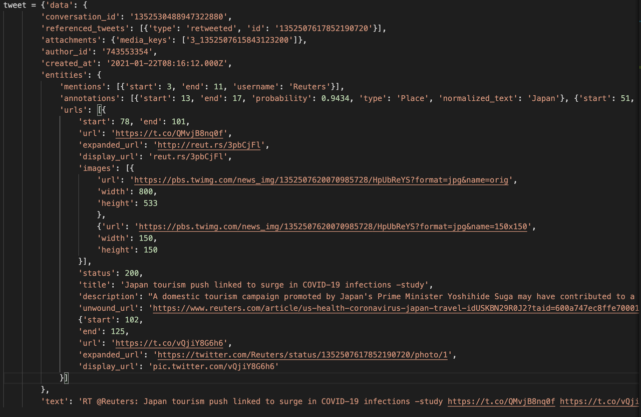 트위터 API로 받아오는 데이터 형태가 딕셔너리 내부에 딕셔너리가 있고, 또 리스트 value 값 안에