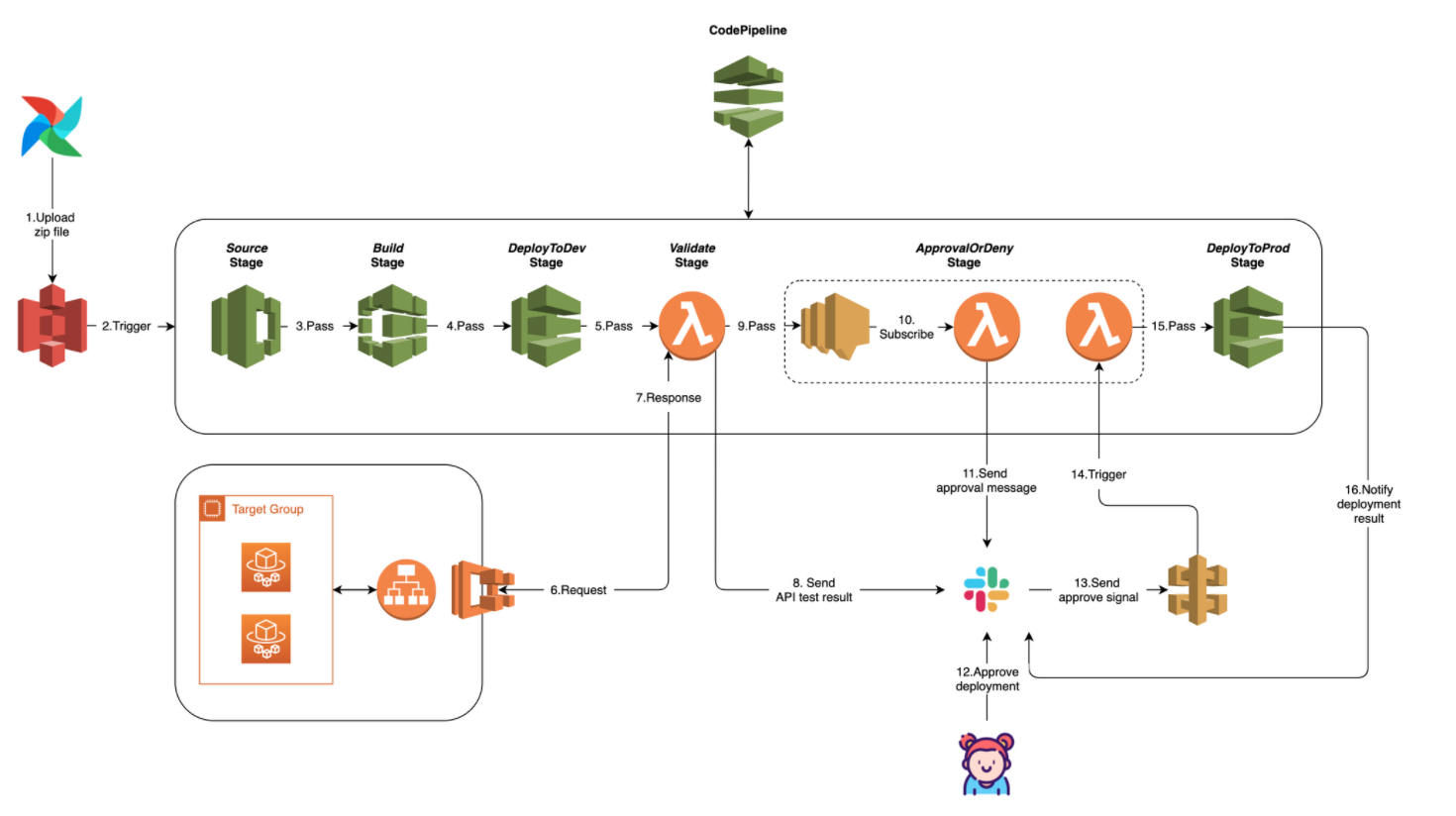 - 승인을 하면 다음 stage로 넘어가고, 승인하지 않으면 해당 codepipeline은 fail 처리되어 종료됨