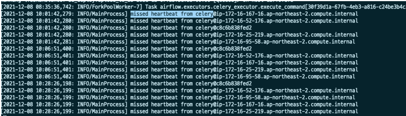 ⇒ 전날(21.12.08)에 인터넷 끊김 현상 때문에 ECS airflow worker fargate와 airflow main Ec2서버, workstation queue 통신이 끊긴 것. 따라서, queue에서 task를 가져와서 수행하는 작업이 이루어지지 않음.