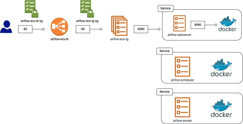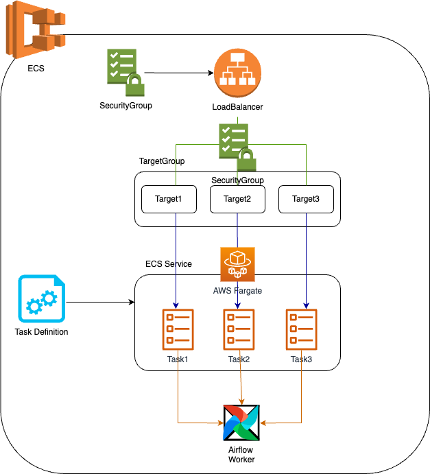 - airflow 각 서비스 구성 요소들(airflow-webserver, airflow-worker, redis)을 하나의 Task로 만들고 LB를 통해 target group에 forwarding(연결)하는 작업