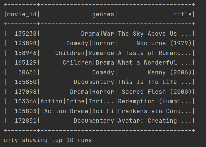 > create table lab.movies (movie_id int primary key, title text, genres text); ## table 확인 > desc tables;- Data 로드