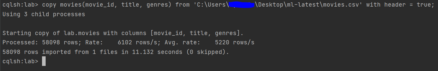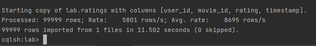 > create table lab.ratings (user_id int, movie_id int, rating double, timestamp bigint, primary key((user_id), movie_id)); ## table 확인 > desc tables;- Data 로드